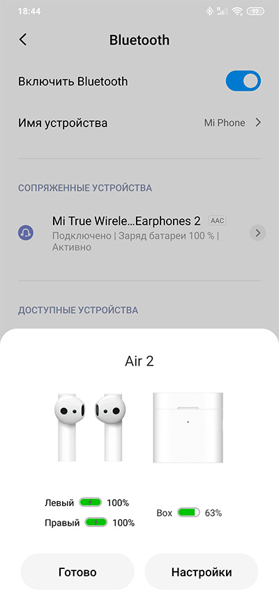 К смартфонам Xiaomi наушники подключаются по кодеку AAC. При этом в смартфоне очень эффектно показывается заряд аккумулятора каждого наушника и кейса.