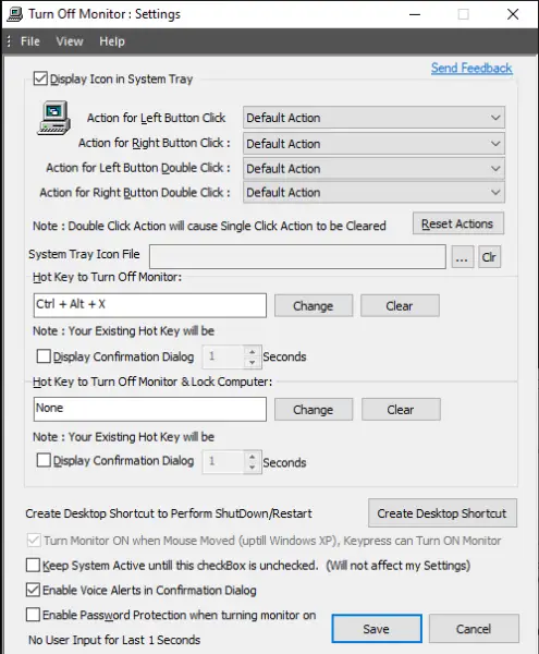 Он предлагает три способа выключить монитор. Вы можете использовать ярлык, ярлык на панели задач или ярлык клавиатуры. Поскольку мы говорим о мгновенном выключении, обязательно настройте сочетание клавиш после его установки. Программа будет доступна в меню «Пуск». Щелкните значок «Отключить настройки монитора», чтобы настроить