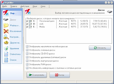 Откройте главное меню программы. Установите галочки на жестких дисках, которые вам необходимо проверить на наличие файлов-дубликатов (по умолчанию выделены все жесткие диски). Также вы можете установить максимальный и минимальный размер файлов для поиска, исключить из поиска определенные форматы файлов или выбрать атрибуты для папок и файлов. После этого щелкните по кнопке «Сканировать», и программа начнет поиск.