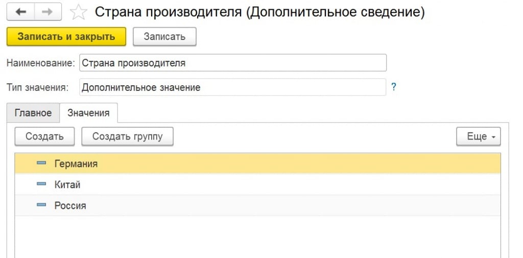 Для примера создадим Страну производителя и укажем на вкладке три страны, которые будут отображаться в списке. Нажмем записать и закрыть.