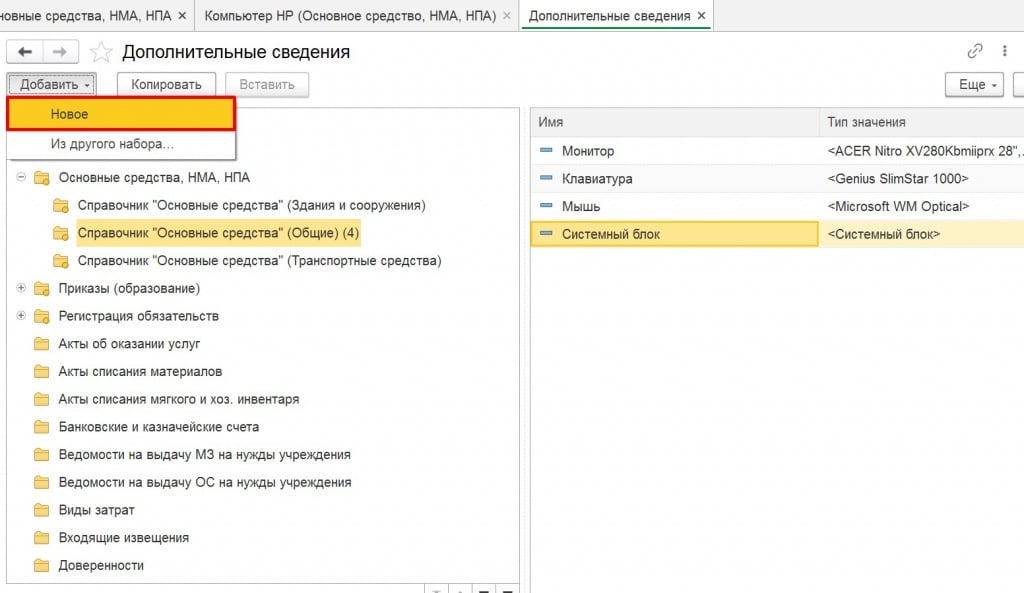 Открывается новая вкладка, в которой по кнопке «Добавить» — «Новое» можно указать новую характеристику.