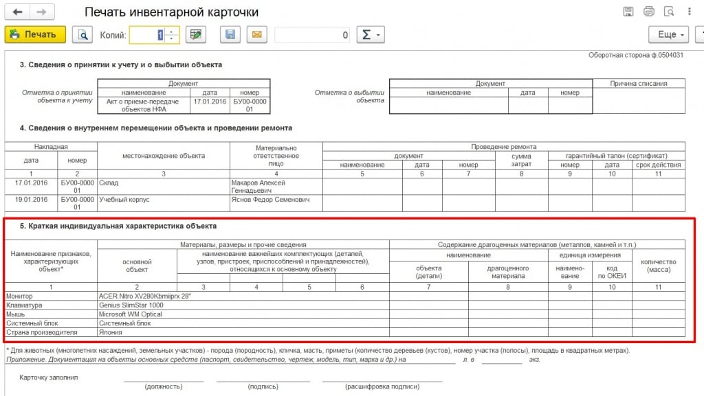 Будем считать, что все необходимые данные мы заполняли. Нажимаем кнопку «Записать и закрыть». В карточке основного средства по кнопке «Печать» выводим инвентарную карточку.