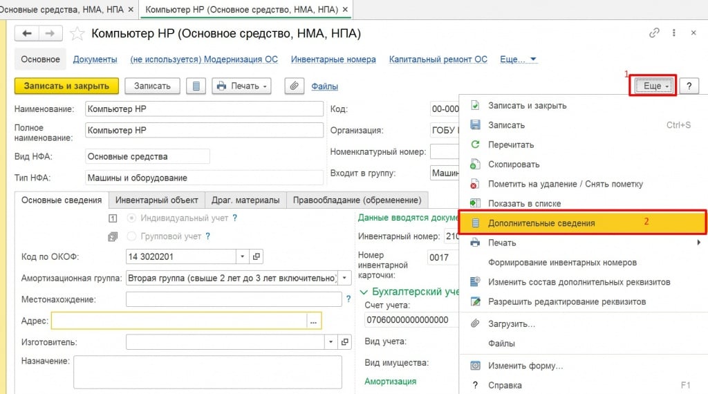 Данные о краткой индивидуальной характеристике объекта заполняются в дополнительных сведениях. Для этого нужно открыть карточку основного средства и нажать на кнопку «Ещё» — «Дополнительные сведения»