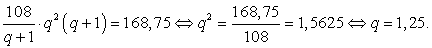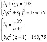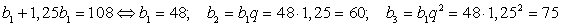 В геометрической прогрессии сумма первого и второго членов равна 108, а третьего и четвертого — 168,75. Найдите первых три члена прогрессии.