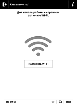Для того, чтобы зарегистрироваться в сервисе, нужно в разделе «Приложения» выбрать пункт «Книги по email». После этого необходимо подключить ридер к сети Wi-Fi. В появившемся окне регистрации введите адрес электронной почты и пароль.
