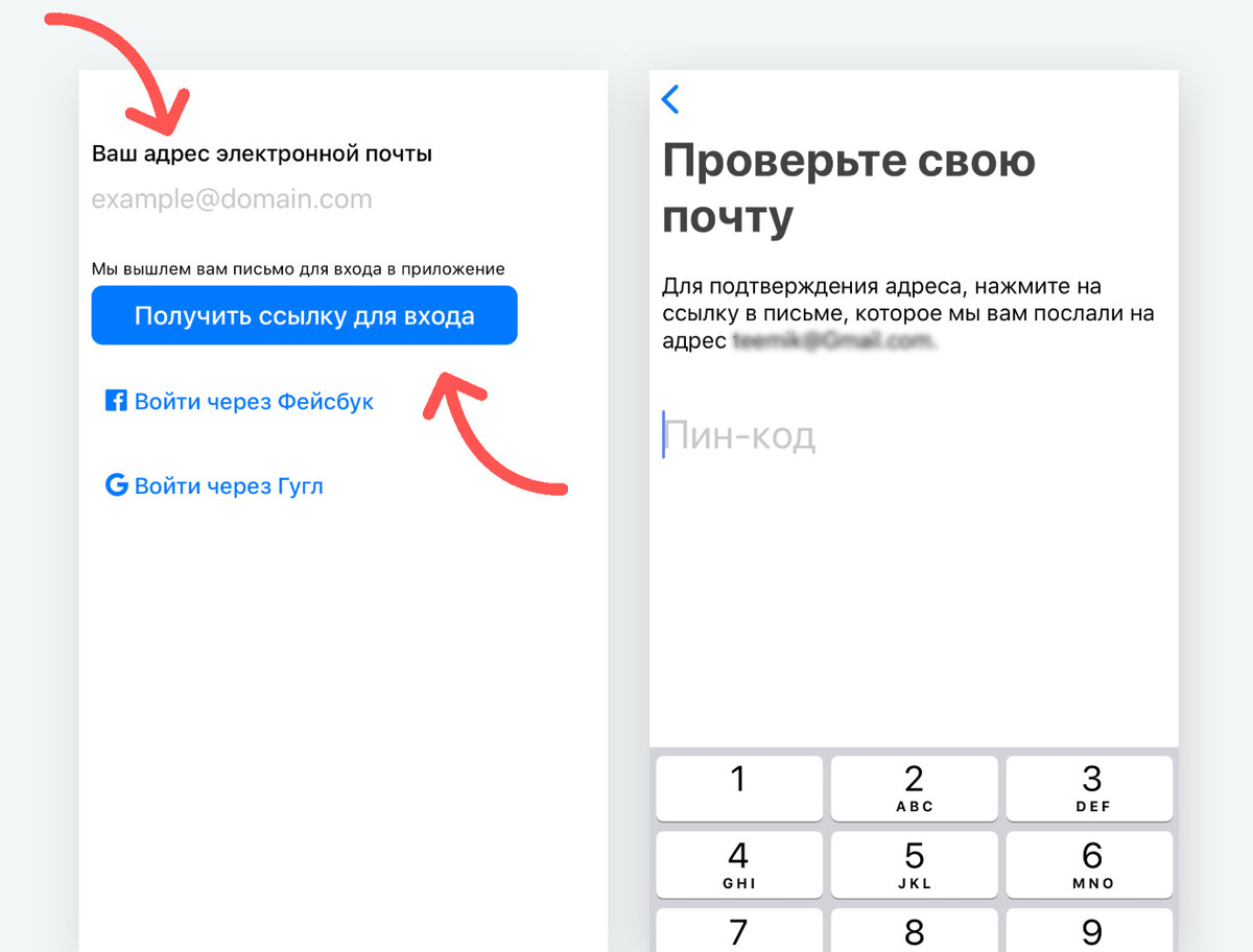 При первом входе в приложение вам будет предложено указать электронный адрес, на который придет ссылка для входа в приложение.