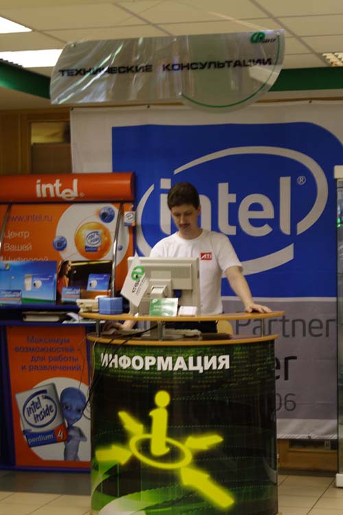 Другой консультант тоже был занят, а третий в данный момент отсутствовал. В конце концов, первый освободился и мы подошли к нему с нашим любимым вопросом о качестве приема PCMCIA тюнеров (видимо, был такой день, что все покупали тюнеры, что не странно, учитывая чемпионат мира по футболу, совмещенный с дачным периодом). Качество консультации оценим как хорошее, правда, консультант не порекомендовал ни одного сайта почитать по данному вопросу, что точно упущение. Один такой мы точно знаем. Хотим отметить вежливость, с которой он раз за разом объяснял предыдущему покупателю его вопрос.