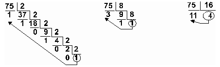 Пример: Перевести число 75 из десятичной системы в двоичную, восьмеричную и шестнадцатеричную: