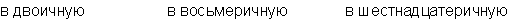 Чтобы перевести число из двоичной системы в восьмеричную или шестнадцатеричную, его нужно разбить влево и вправо от запятой натриады (для восьмеричной) или тетрады (для шестнадцатеричной) и каждую такую группу заменить соответствующей восьмеричной (шестнадцатеричной) цифрой.