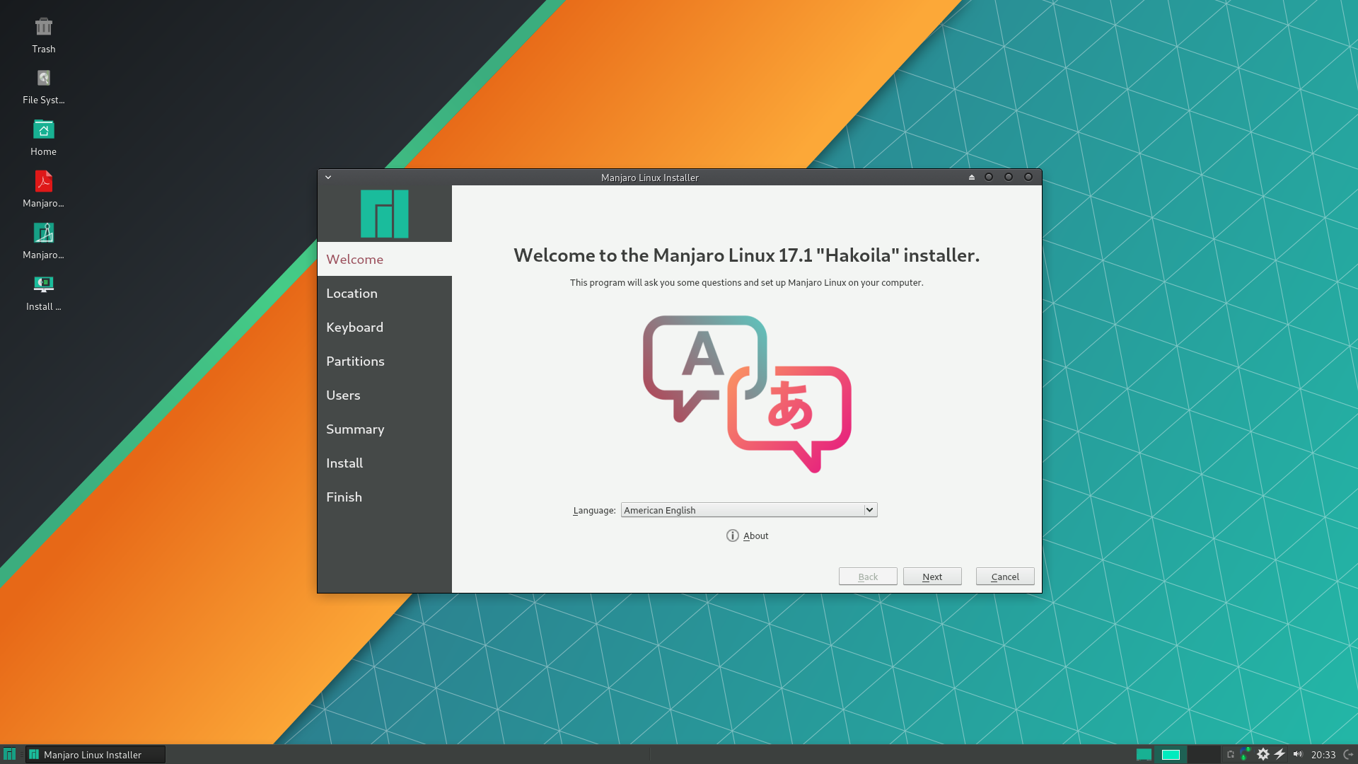 Дважды кликаем мышью на ярлык “Install Manjaro Linux” и попадаем в установщик.