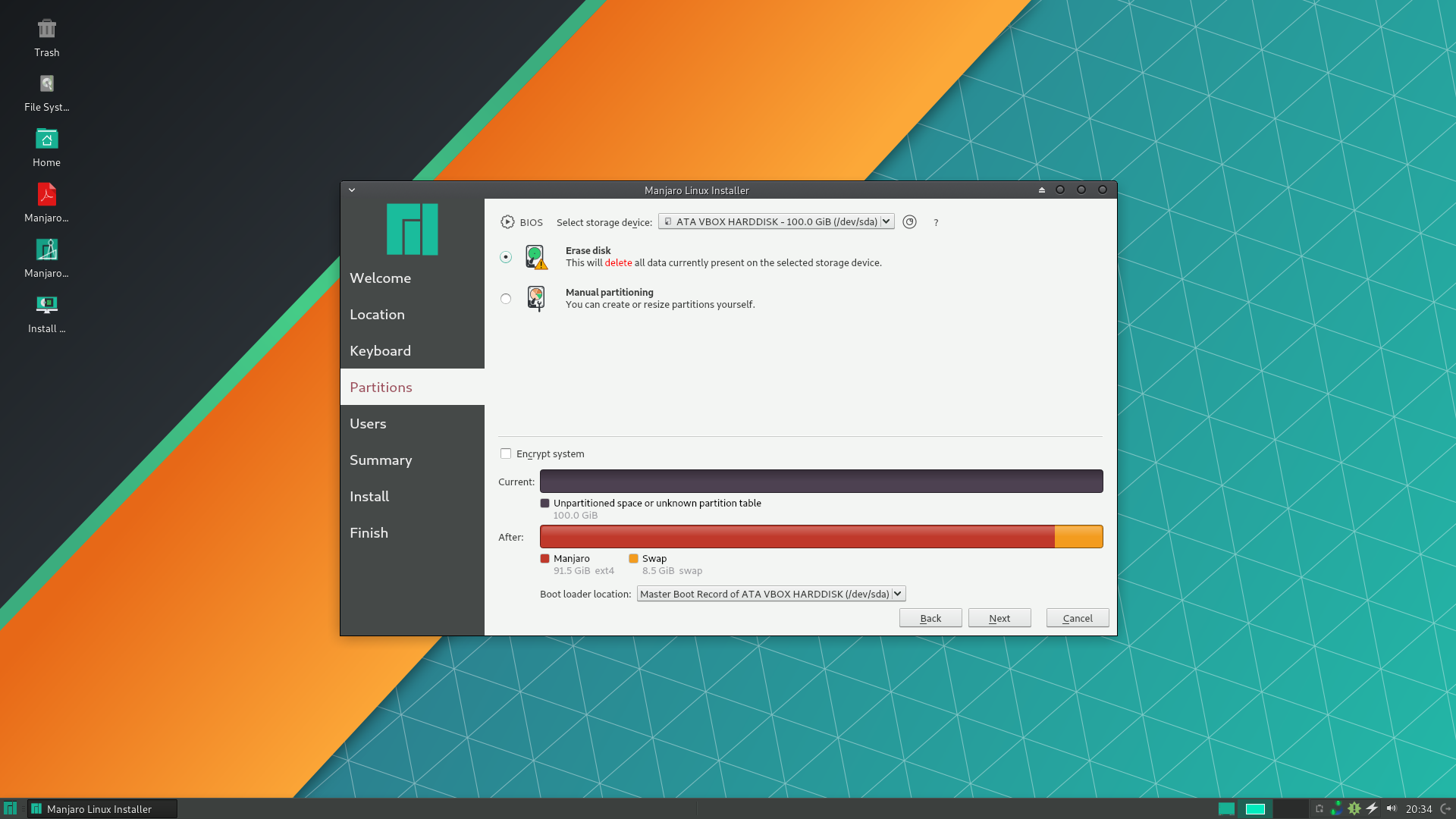 A virtual machine is a computer that runs “in” your current computer. If you just want to try or use Manjaro without rebooting your computer, you can set up a virtual machine. We will give you a quick step-by-step guide, but if you want to know more, visit our Wiki. Keep in mind that if you use a virtual machine, you only wipe the machine, not your actual computer.
