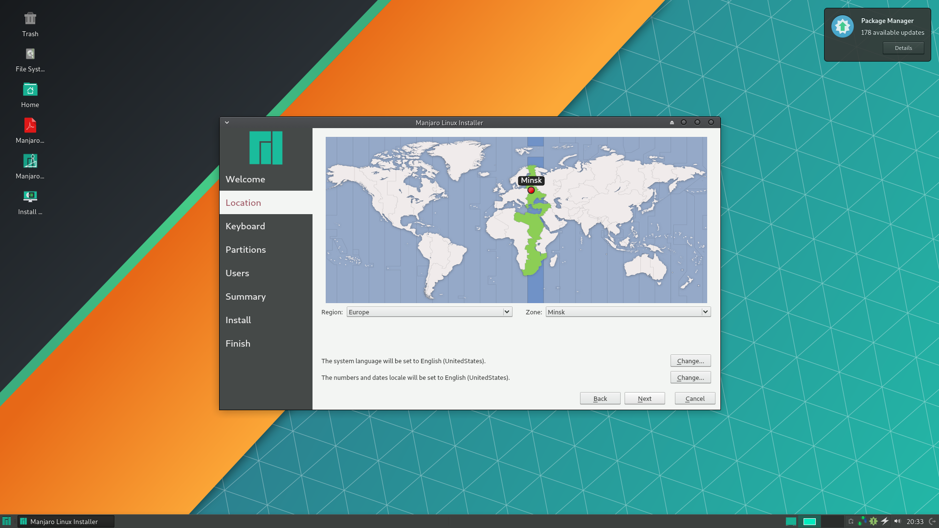 После этого выберите часовой пояс и раскладку клавиатуры. Перейдите к опции «Boot» и нажмите Enter, чтобы загрузиться в Manjaro. После загрузки вы увидите экран приветствия.