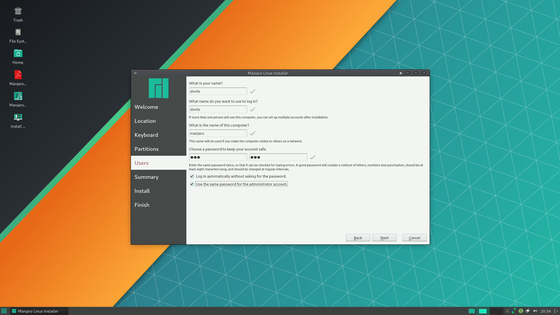 Next, we fill in the user data. Username and passwords will be set here. You can set different passwords for normal use and for adminstrative tasks (root access). There’s also an option to enable auto login at boot.