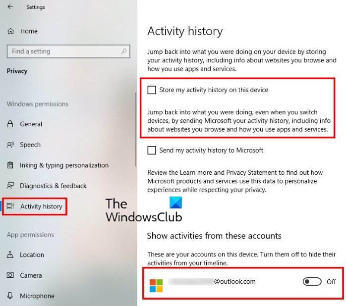 - Снимите флажок Сохранить мои действия на этом устройстве и выключите переключатель рядом с вашей учетной записью Microsoft в разделе Показать действия из этих учетных записей.